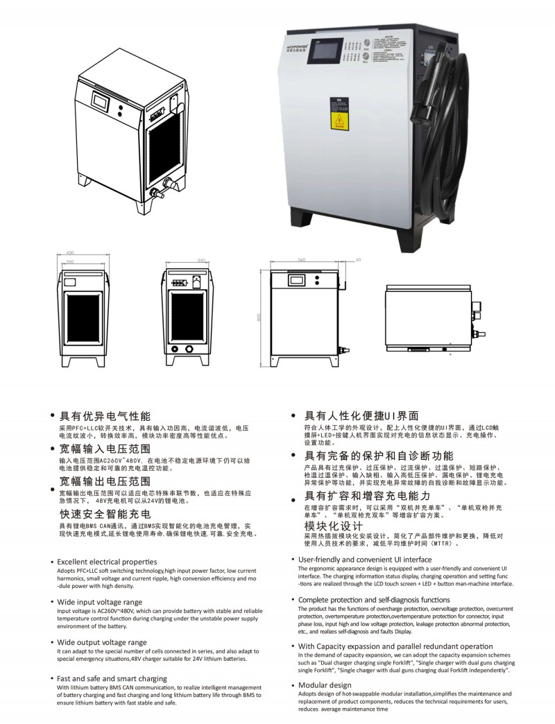 觸摸屏智能操作設(shè)計:告別傳統(tǒng)按鍵方式,給您帶來更現(xiàn)代更具科技智能的操作體驗 自動充電:插槍自動充電,簡化充電流程,便于操作 兼容性高:80V200A兼容48V200A充電 多重保護: 輸出短路,過流過壓保護,反接保護,電流導(dǎo)管保護等多重保護 預(yù)約充電功能:避開高峰用電時段,有效節(jié)省成本 雙語切換:中英文雙語隨需切換,跨越語言障礙,與世界接軌 人性化設(shè)計:充電機背板內(nèi)部附部件明細(xì)及產(chǎn)品接線圖,方便客戶可更清楚的了解產(chǎn)品,便于維修,提高售后時效 獨特設(shè)計: 內(nèi)置電磁鎖驅(qū)動模塊,防止臨時斷電鎖槍 使用壽命更長:功率模塊預(yù)留20%空間,提高模塊的使用壽命 出色內(nèi)部結(jié)構(gòu): 內(nèi)部結(jié)構(gòu)左右出風(fēng),內(nèi)部電路不容易積粉塵,提高充電機壽命