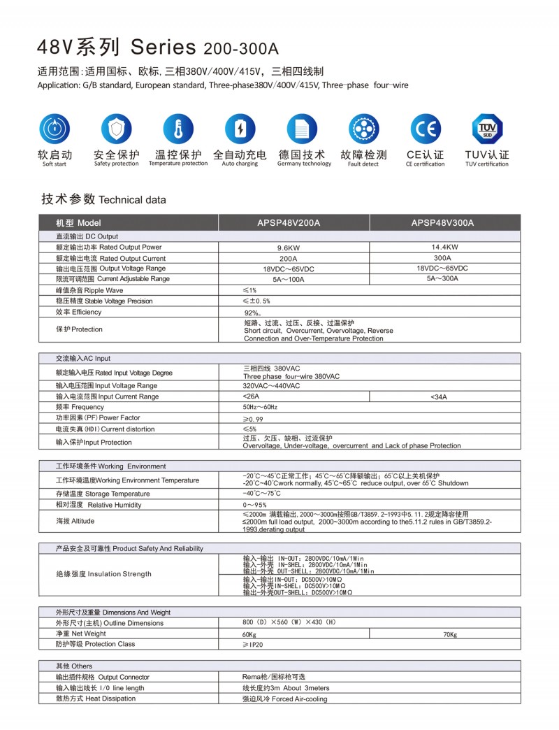觸摸屏智能操作設計:告別傳統(tǒng)按鍵方式,給您帶來更現代更具科技智能的操作體驗 自動充電:插槍自動充電,簡化充電流程,便于操作 兼容性高:80V200A兼容48V200A充電 多重保護: 輸出短路,過流過壓保護,反接保護,電流導管保護等多重保護 預約充電功能:避開高峰用電時段,有效節(jié)省成本 雙語切換:中英文雙語隨需切換,跨越語言障礙,與世界接軌 人性化設計:充電機背板內部附部件明細及產品接線圖,方便客戶可更清楚的了解產品,便于維修,提高售后時效 獨特設計: 內置電磁鎖驅動模塊,防止臨時斷電鎖槍 使用壽命更長:功率模塊預留20%空間,提高模塊的使用壽命 出色內部結構: 內部結構左右出風,內部電路不容易積粉塵,提高充電機壽命