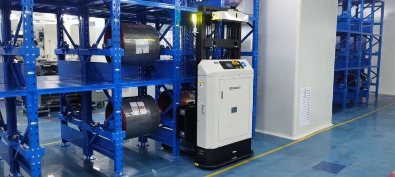 據了解,在涂布分切的前段卷料環節,又包括上設備與上緩存庫兩個方面。電池生產節拍緊湊,設備對接精度高,創智針對這個環節深度定制研發了舉升式與叉臂式兩款AGV產品。叉臂式AGV相當于堆高叉車的懸臂,能夠實現上設備及緩存庫的高精度全自動對接。