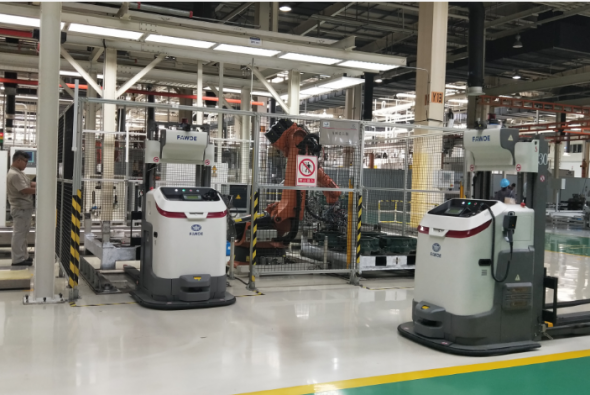 該項目中,通過多臺艾吉威叉車AGV在提升機/轉存區/生產工位連續協同工作,實現廠內物料供應的自動化轉運。