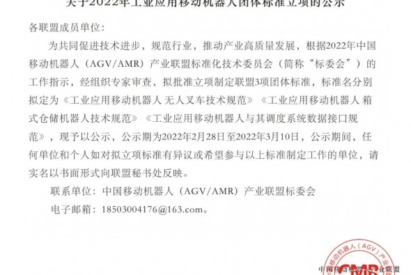 關(guān)于2022年工業(yè)應(yīng)用移動(dòng)機(jī)器人團(tuán)體標(biāo)準(zhǔn)立項(xiàng)的公示