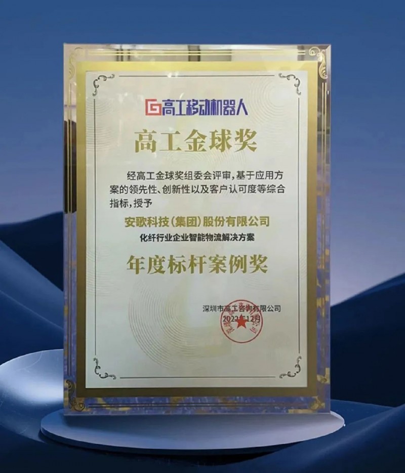 2022年12月安歌科技的化纖解決方案憑借優秀的團隊配合度、創新的技術、杰出的集成能力,以及自研自產的硬件+軟件+系統+服務的創新集成模式,榮膺2022化纖行業企業智能物流解決方案 年度標桿案例獎。