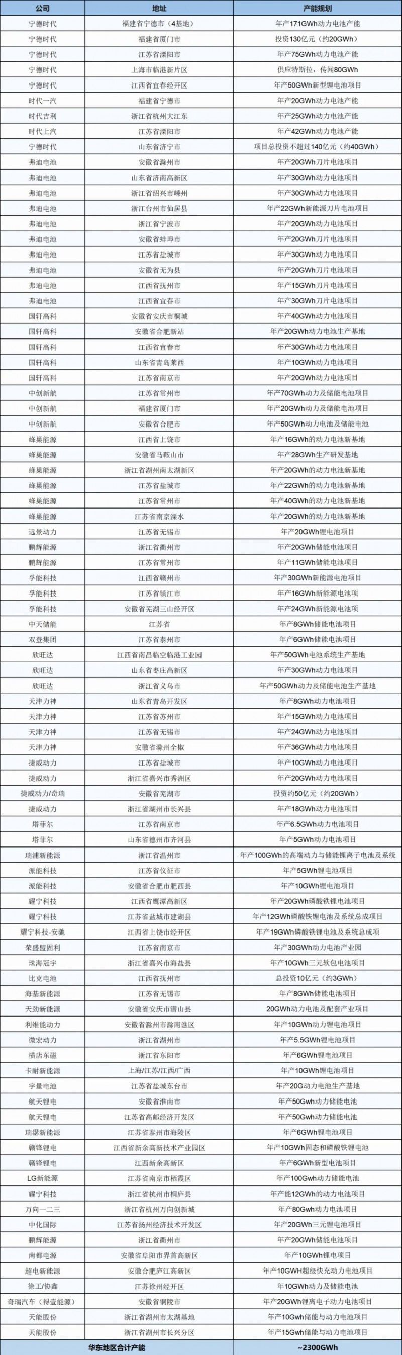 全國動力與儲能電池基地產能統(tǒng)計表1---華東地區(qū)