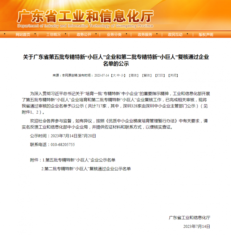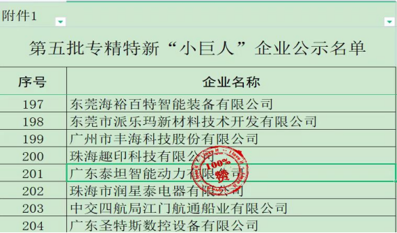 2023年7月14日,廣東省工業和信息化廳發布了《關于廣東省第五批專精特新“小巨人”企業和第二批專精特新“小巨人”復核通過企業名單的公示》,廣東泰坦智能動力有限公司通過國家級專精特新企業審核,榮獲“小巨人”稱號。