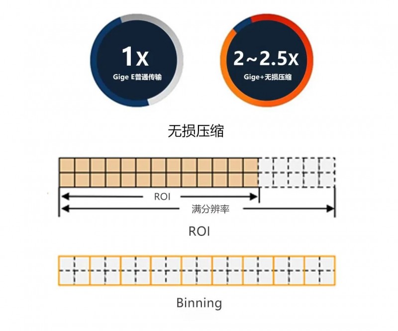新型號支持無損壓縮功能,突破千兆網(wǎng)帶寬限制,將行頻提升2倍左右;同時可支持ROI/Binning提行頻,靈活兼容低分辨率的高速應用需求,提升用戶產(chǎn)能。