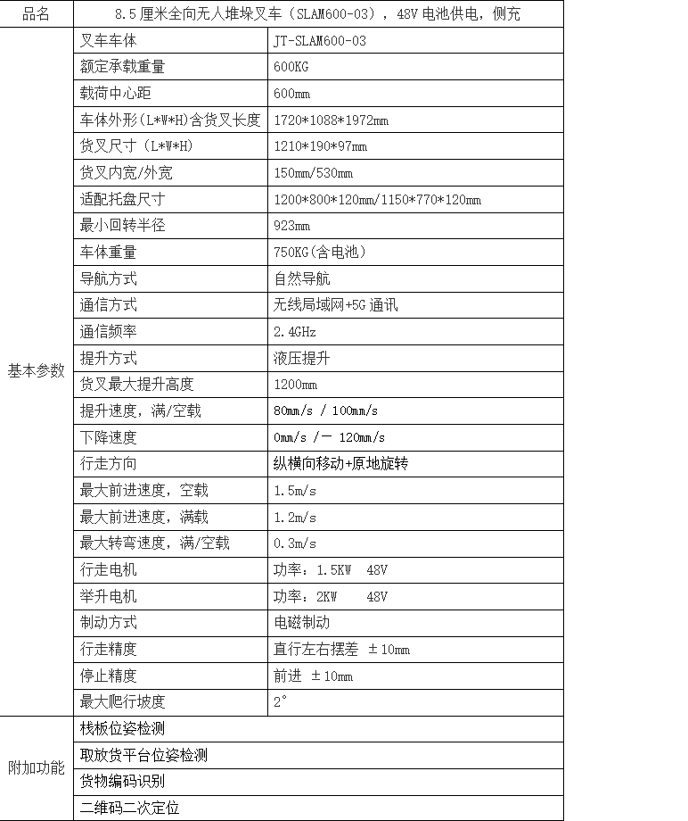 8.5厘米全向無人堆垛叉車,采用自然導航及二維碼二次定位技術,可縱橫向移動及原地旋轉,全向運行;載重600KG;最大舉升高度1200mm;配備嘉騰自主研發的超低、超窄全向模組,體積小巧、運行靈活,支持2M巷道物料搬運;支持棧板位姿、貨物編碼、貨位狀態檢測;使用3D 激光雷達和安全型傳感器全方位避障;配備行車記錄儀和運行輪廓警示燈。