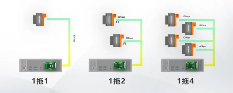 ??禉C器人推出了不同XoFlink接口數量的配套采集卡,搭配相機自身支持的1link和2link兩種工作模式,可支持1拖1、1拖2、1拖4等多種連接方式,安裝便捷??蛻艨筛鶕π蓄l及整套方案的架設需求靈活選擇拓撲連接模式。