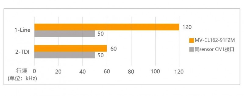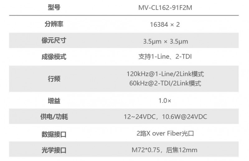 相機(MV-CL162-91F2M)采用兩線COMS Sensor,支持2-TDI成像,且在開啟2-TDI后可保持60kHz行頻高速采集,兼顧高速采集和亮度提升,降低視覺系統對環境光源的要求。