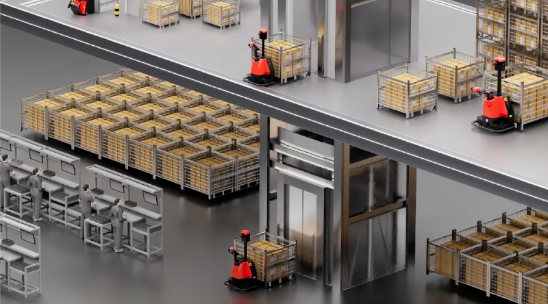 該客戶需頻繁將10樓倉庫物料搬運(yùn)至8樓產(chǎn)線,協(xié)同產(chǎn)線高效生產(chǎn)