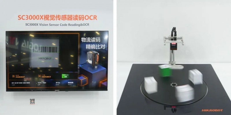 該相機集成像、算法、存儲、通信于一身,內部嵌入了讀碼、有無、正反、測量、識別和計數等防錯檢測算法,充分保證信息讀取的準確性。現場展示SC3000X對物流面單碼和OCR的讀取情況,即便面單在轉盤上高速轉動,相機仍可穩定讀取作業,且對碼和字符進行對比,是3C流通行業追溯信息的重要保障。