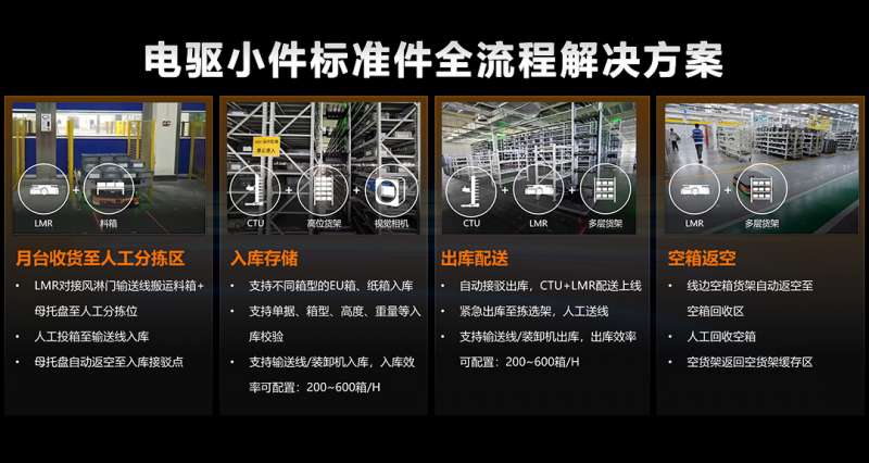 電驅(qū)系統(tǒng)作為新能源汽車的核心部件,其制造具有復(fù)雜性、工序多樣性的特點。其中,小件標(biāo)準(zhǔn)件種類繁多,傳統(tǒng)方式難以實現(xiàn)精細(xì)化管理;工序間轉(zhuǎn)運對接精度要求高,且隨產(chǎn)能波動,轉(zhuǎn)運存在勞動強(qiáng)度大、準(zhǔn)確性及時性難以把控的問題。