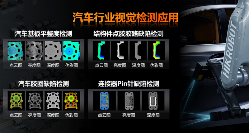 在汽車行業(yè)中,質(zhì)量缺陷檢測至關(guān)重要。海康機(jī)器人擁有成熟的產(chǎn)品和解決方案,可應(yīng)用于多個環(huán)節(jié),包括汽車基板平整度檢測、深度圖與點云圖的拼接,以及結(jié)構(gòu)件點膠膠路缺陷檢測和連接器Pin針缺陷檢測等。