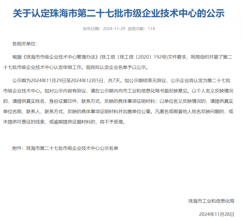 2024年11月29日,珠海市工業(yè)和信息化局發(fā)布了《關(guān)于認(rèn)定珠海市第二十七批市級(jí)企業(yè)技術(shù)中心的公示》,廣東泰坦智能動(dòng)力有限公司成功入選“珠海市第二十七批市級(jí)企業(yè)技術(shù)中心”,此次入選不僅是對(duì)公司過(guò)去努力的肯定,更是對(duì)未來(lái)發(fā)展的期許。