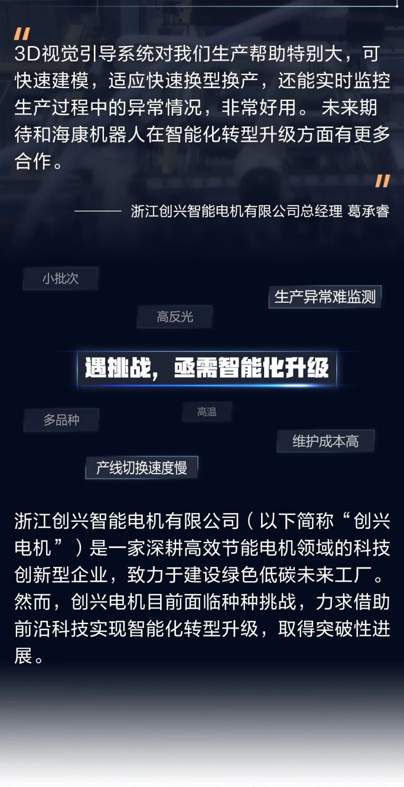 創(chuàng)興電機從需求匹配、生產(chǎn)效率、異常監(jiān)測、數(shù)字化管理、建設(shè)成本等多個維度考慮,最終選擇與海康機器人攜手,以工業(yè)4.0為標(biāo)準(zhǔn)打造未來工廠。