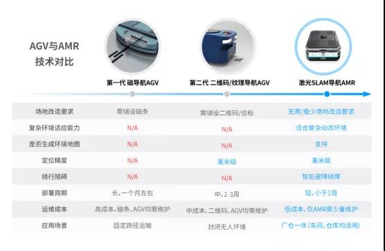其實(shí),AGV發(fā)展至今已經(jīng)歷了三次技術(shù)變革。行業(yè)內(nèi)普遍依據(jù)導(dǎo)航方式的不同將其劃為:第一代磁導(dǎo)航AGV,第二代二維碼/信標(biāo)導(dǎo)航AGV,以及第三代自然導(dǎo)航AGV,又稱(chēng)AMR(自主移動(dòng)機(jī)器人)。