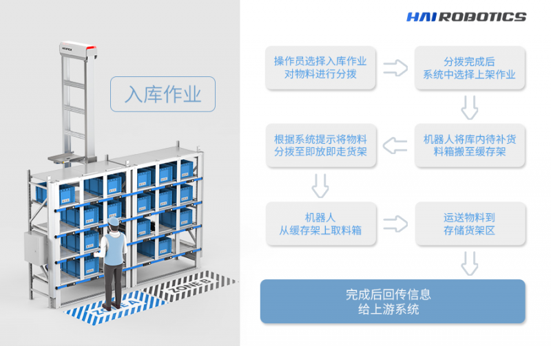 入庫:通過緩存貨架的方式,減少人機(jī)等待時(shí)間,提升入庫的效率。