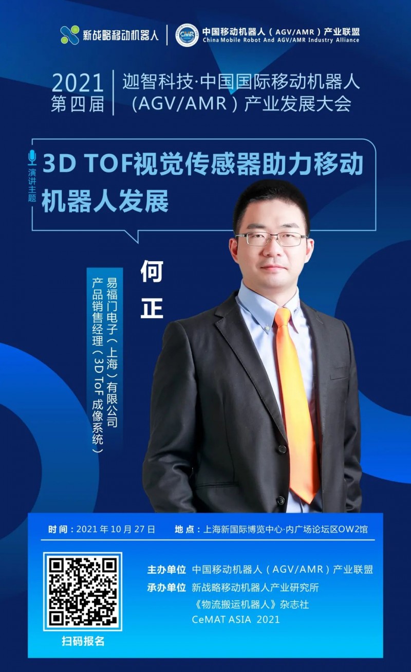 10月27日,在中國移動機器人(AGV/AMR)產業聯盟主辦的《第四屆國際移動機器人大會》上,易福門電子(上海)有限公司產品銷售經理何正將帶來“機器人之眼:3D ToF相機帶來的無限可能”主題分享,敬請期待!