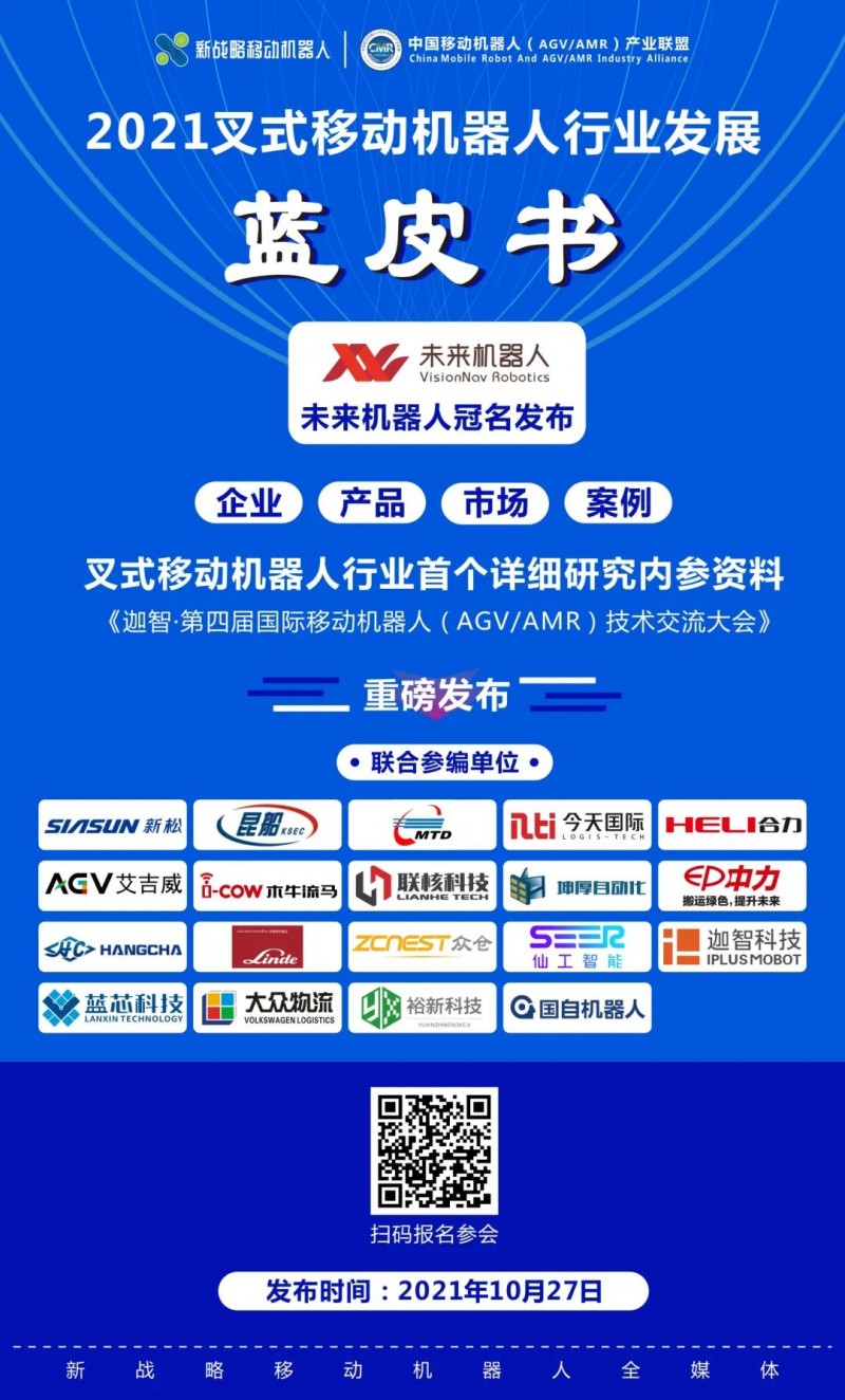 10月27日,在由迦智科技獨家冠名,中國移動機器人(AGV/AMR)產業聯盟主辦、《物流搬運機器人》雜志社 、新戰略移動機器人產業研究所 、CeMAT ASIA承辦的“迦智科技·第四屆中國國際移動機器人(AGV/AMR)產業發展大會”上,《2021叉式移動機器人行業發展藍皮書》將正式發布!