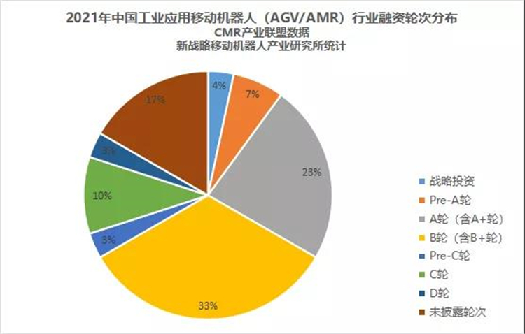 從融資輪次看,2021年工業(yè)應(yīng)用移動機(jī)器人領(lǐng)域,戰(zhàn)略融資1起,占比為4%;Pre-A輪2起,占比7%;A輪(含A+輪)7起,占比23%;B輪(含B+輪)10起,占比33%;Pre-C輪1起,占比3%;C輪3起,占比10%,D輪1起,占比3%;5起未披露輪次,占比17%。